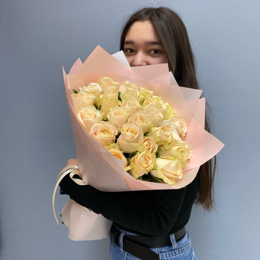 На фото букет из 25 кремовых роз. В составе: роза 25 шт, дизайнерская упаковка 2 шт, атласная лента 2 шт, . Все цветы свежие и ароматные, букет красиво оформлен и отлично подходит для подарка. Доступна доставка цветов или самовывоз.