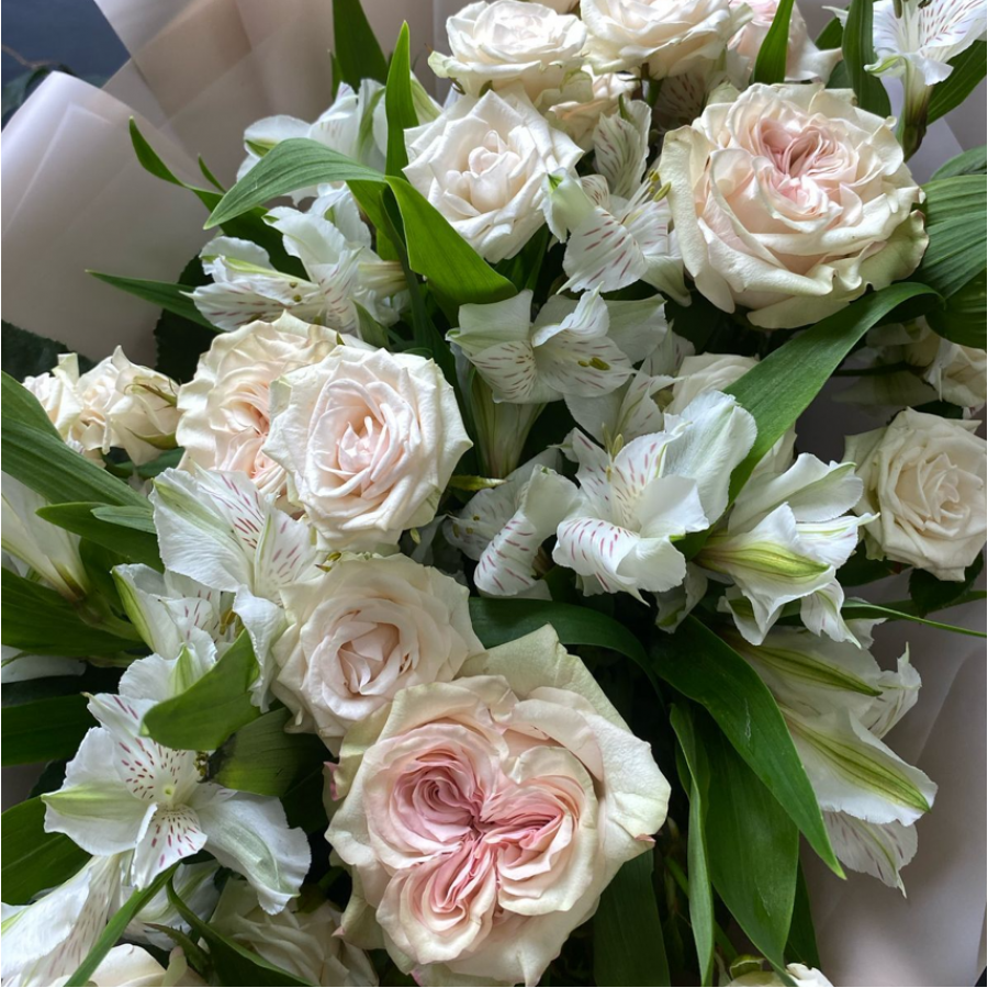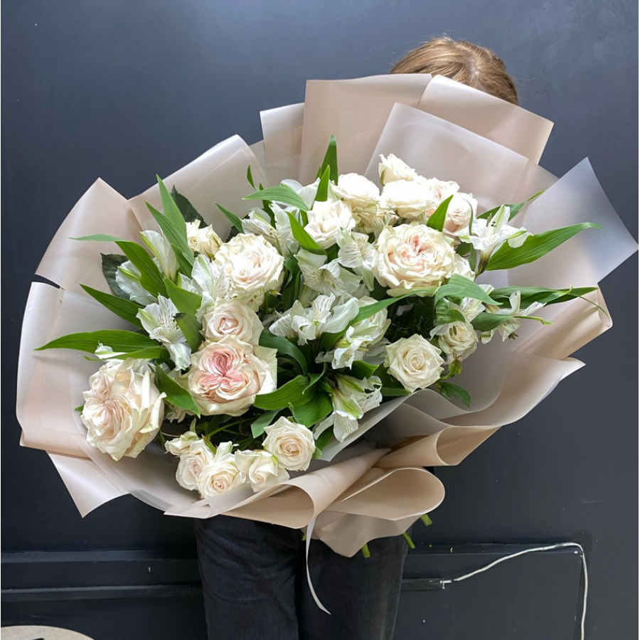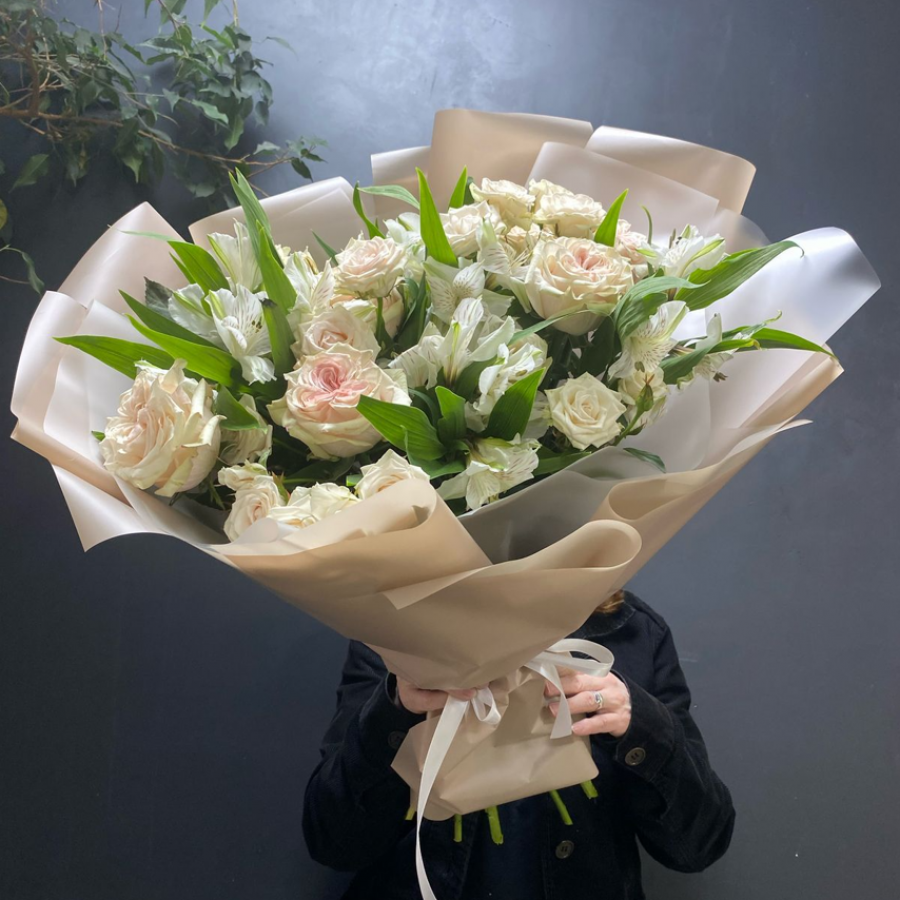 Букет из кустовых пионовидных роз нежно-розового оттенка с белоснежными акцентами и альстромерий в мягких персиково-кремовых тонах, дополненный зеленью, обернут в эко-стильную крафт-бумагу и украшен атласной лентой, подойдет для женщин любого возраста на любое торжество или романтический случай благодаря своей элегантности и универсальности.