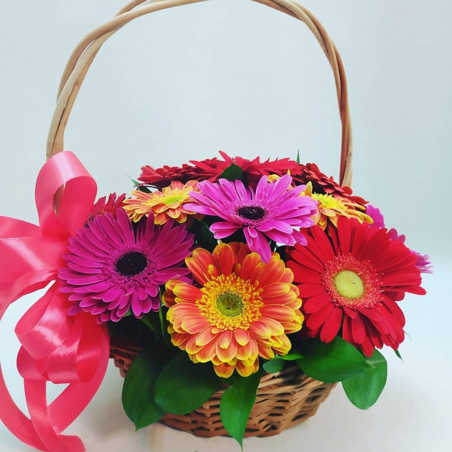 Композиция из 15 разноцветных гербер в корзине в Льгове